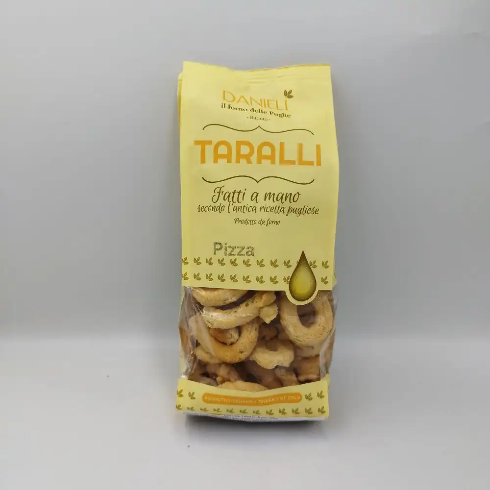 Η Danieli έχει δημιουργήσει μια ολόκληρη σειρά από παραδοσιακά αλλά και πρωτότυπα taralli, και η εκδοχή Pizza είναι η πιο παιχνιδιάρικη και αγαπητή στους λάτρεις της ιταλικής κουζίνας. Πρόκειται για ένα προϊόν που συνδυάζει την αυθεντικότητα με την καθημερινή απόλαυση, ένα σνακ που φέρνει τη γεύση της Ιταλίας σε κάθε σπίτι.