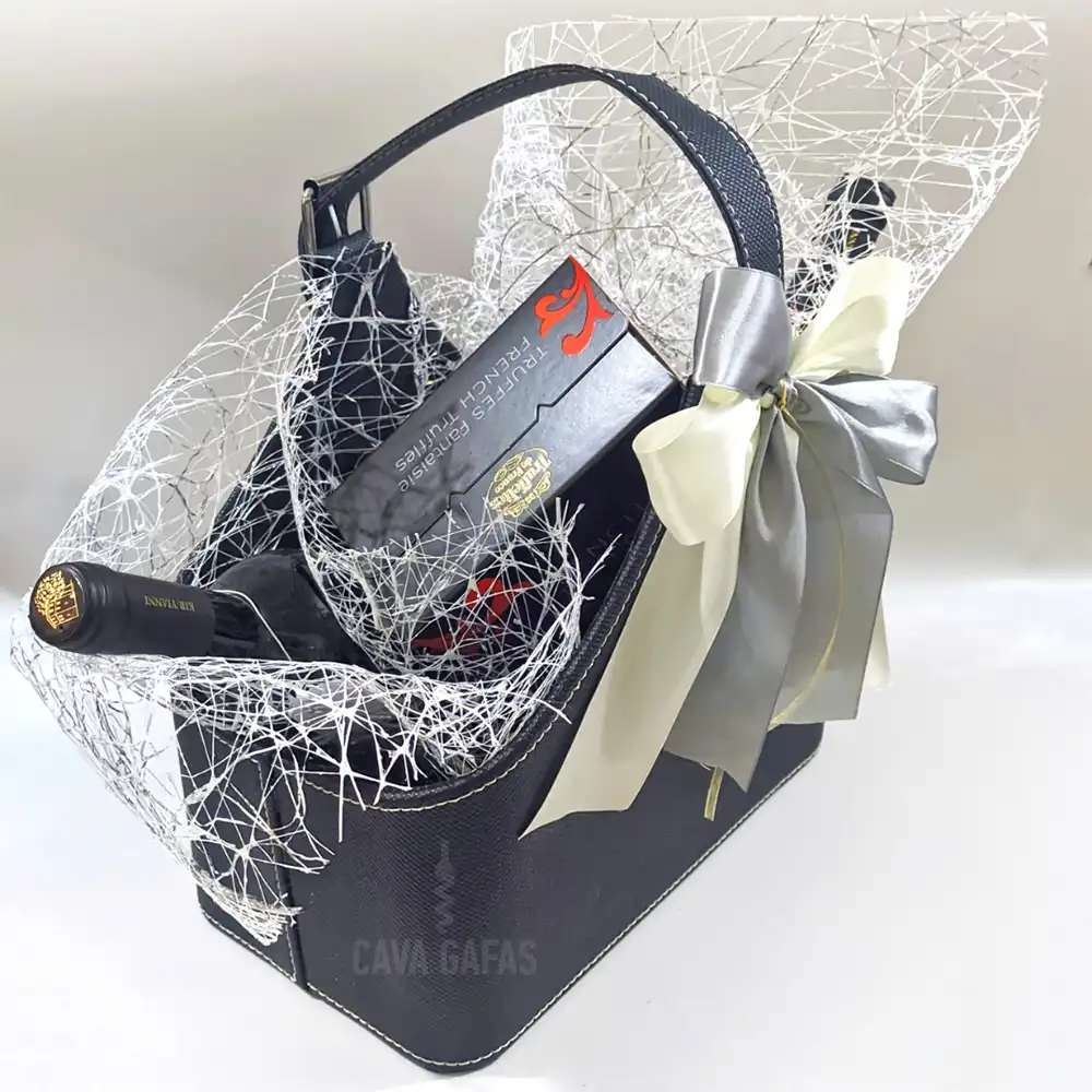 Η Σύνθεση Δώρου με Δερμάτινο Καλάθι και δύο εκλεκτές φιάλες συνοδεία σοκολατάκια αποτελεί έναν πραγματικά κομψό και πολυτελή τρόπο για να εκφράσετε την εκτίμησή σας. Το δερμάτινο καλάθι δεν είναι μόνο μια εντυπωσιακή συσκευασία, αλλά και ένα πρακτικό αντικείμενο που μπορεί να αξιοποιηθεί ξανά, δίνοντας διαχρονική αξία στο δώρο. Η αρμονία ανάμεσα στις επιλεγμένες ετικέτες κρασιού και τις γαλλικές τρούφες με κονιάκ δημιουργεί μια ολοκληρωμένη εμπειρία που ισορροπεί ανάμεσα στο κρασί και τη γλυκιά απόλαυση.