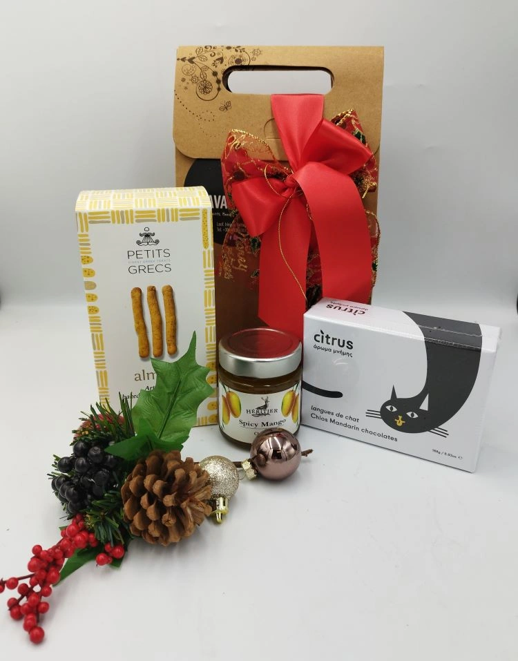 Περιλαμβάνει αλμυρά κριτσινάκια της Petitis Grecs γνωστής για την ποιότητα των προϊόντων της. Ένα chutney από πικάντικο mango που ταιριάζει με ημίξηρα κρασιά και σοκολάτες Χιώτικου Μανταρινιού της Citrus. Οι σοκολάτες langues de chat της Citrus είναι φτιαγμένες από μαύρη σοκολάτα και έχουν μακρύ, λεπτό σχήμα που θυμίζει γλώσσα γάτας. Έχουν γέμιση από μαρμελάδα Χιώτικου Μανταρινιού.